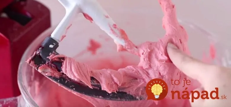 Pridajte 1/3 šálky jahodového džemu bez jadierok a uberte trochu cukru. Do krému pridajte aj niekoľko kvapiek červeného potravinárskeho farbiva, aby sme získali červenú farbu.