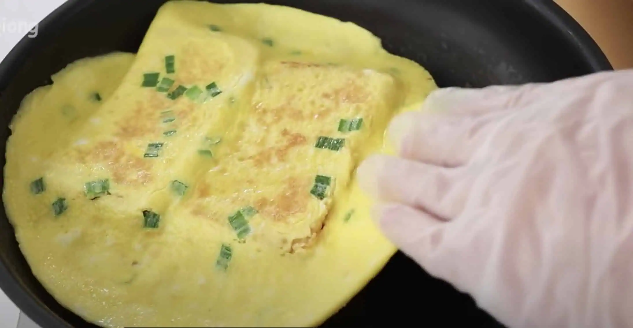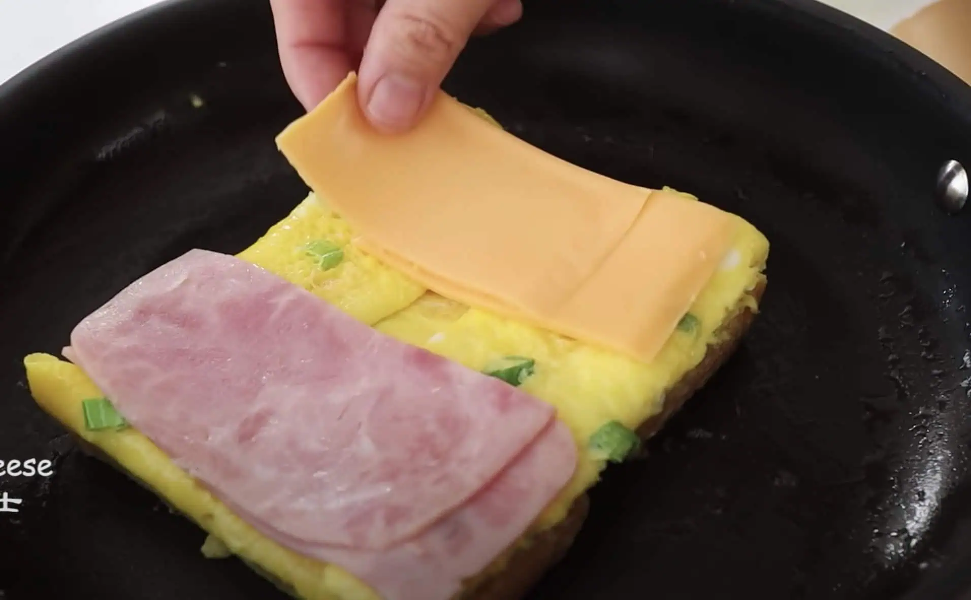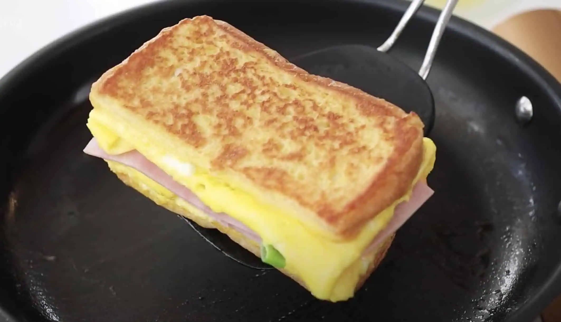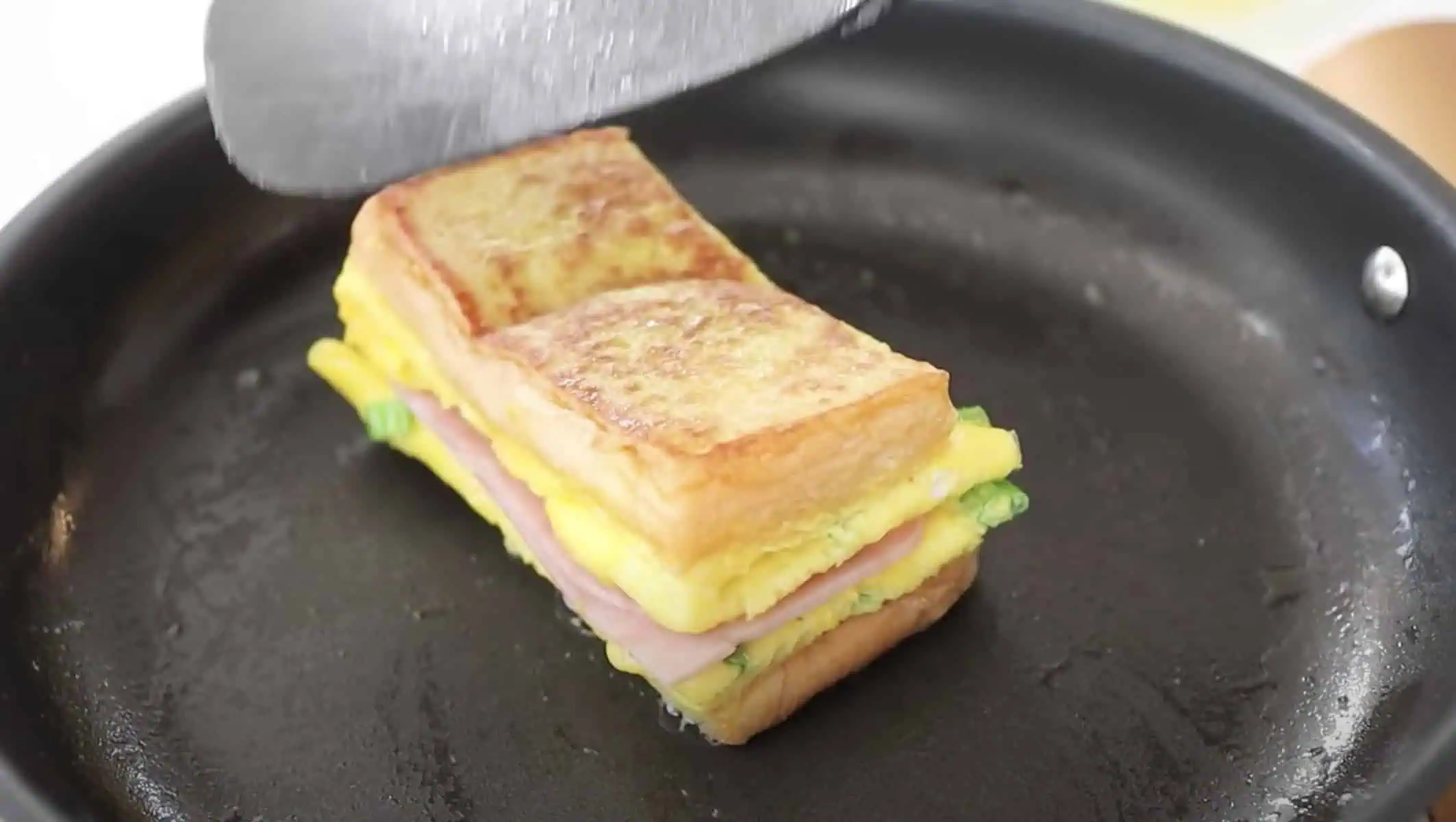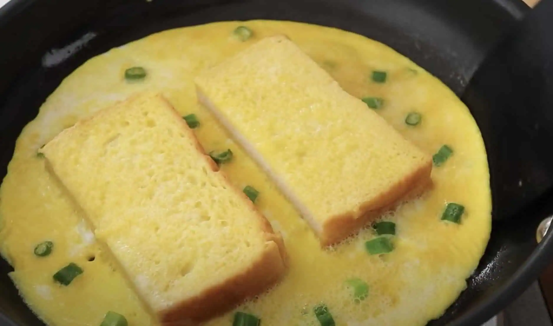 Keď je vaječená zmes stuhne, obrátime spolu s chlebíkom na opačnú stranu.