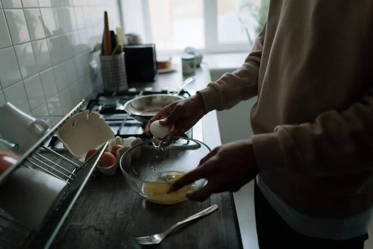 Do misky pridáme vajcia, mlieko a metličkou vyšľaháme.