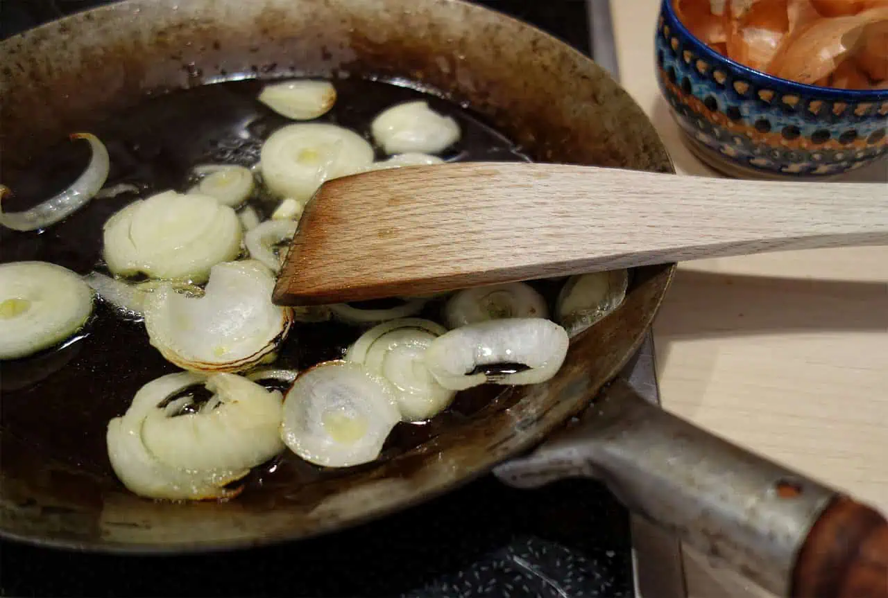 Potom na panvici na oleji 2-3 minúty smažíme nakrájanú cibuľu.