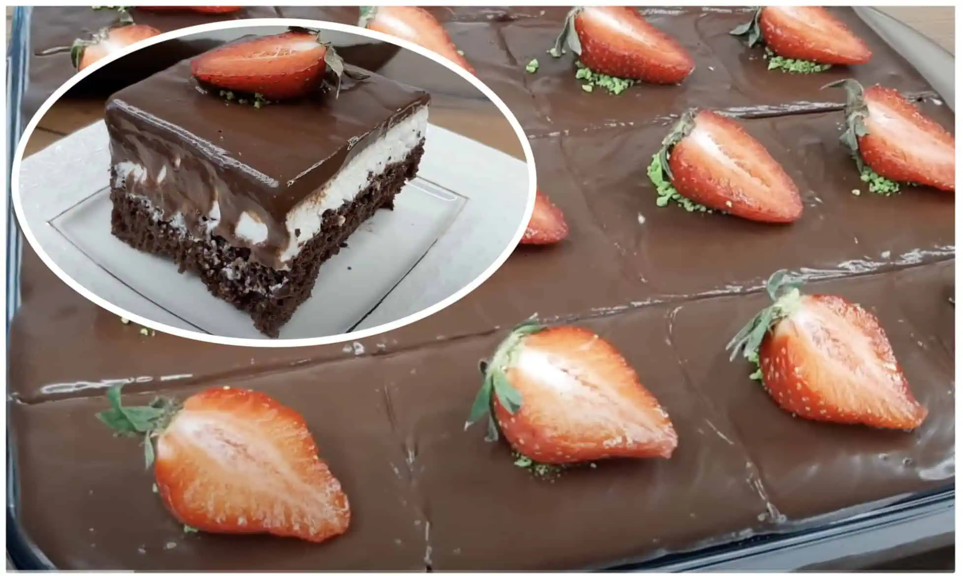 Vynikajúci čokoládový koláč s krémom a polevou z čokolády.