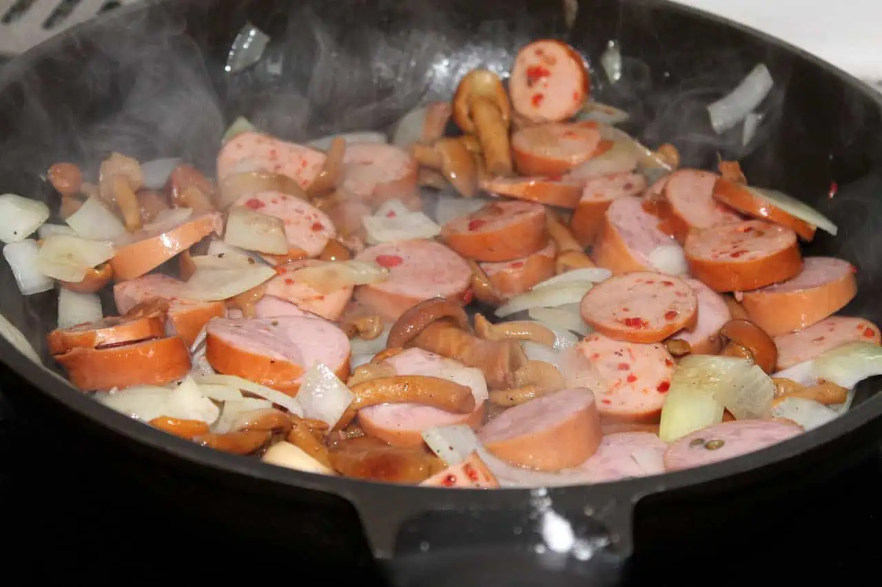 Potom pridáme klobásu a premiešame.