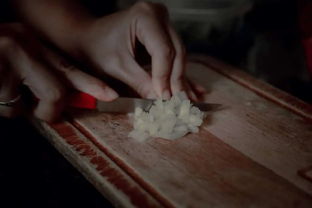 Cibuľu nakrájame na drobno, vložíme ju do panvice, premiešame a smažíme.