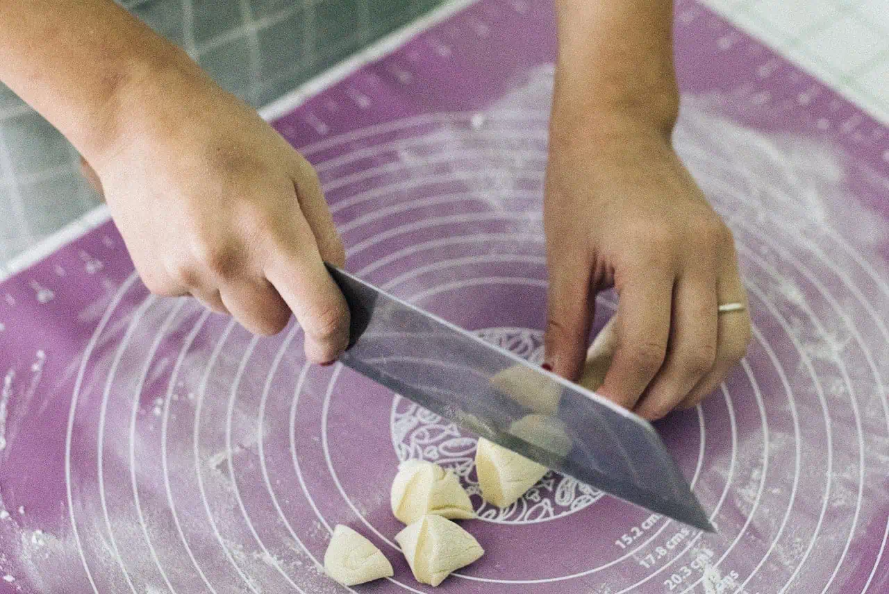 Každú rolku nakrájame ostrým nožom na trojuholníky.