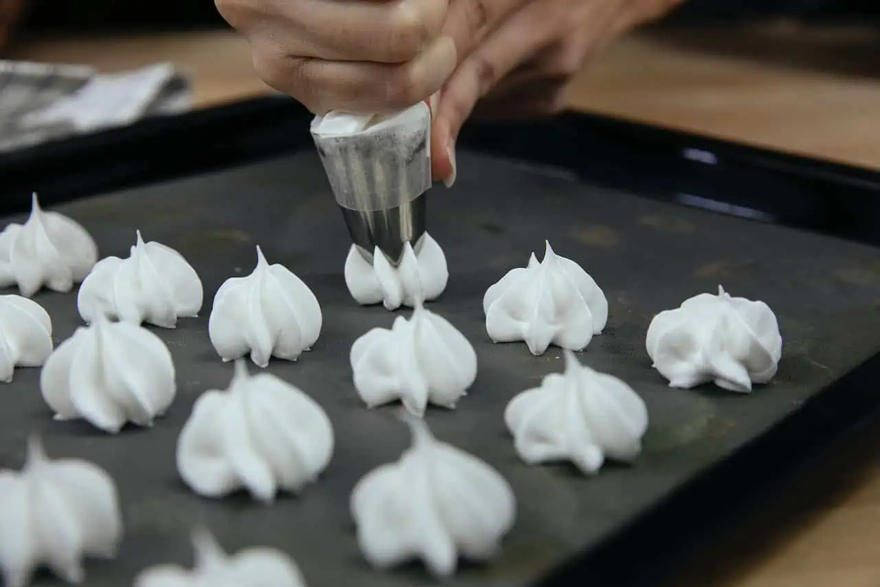 Pripravenú hmotu dáme na plech vystlaný papierom na pečenie. Môžeme to urobiť pomocou cukrárskeho vrecka, vytvárať malé ružičky alebo jednoducho robiť malé kôpky lyžičkou.