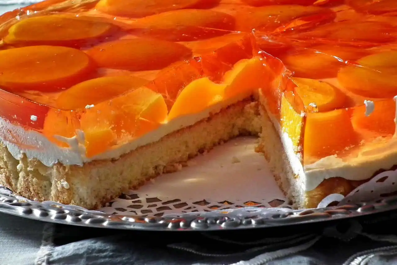 Broskyňové plátky so želé nanesieme na vrch stuhnutého krému vo forme.