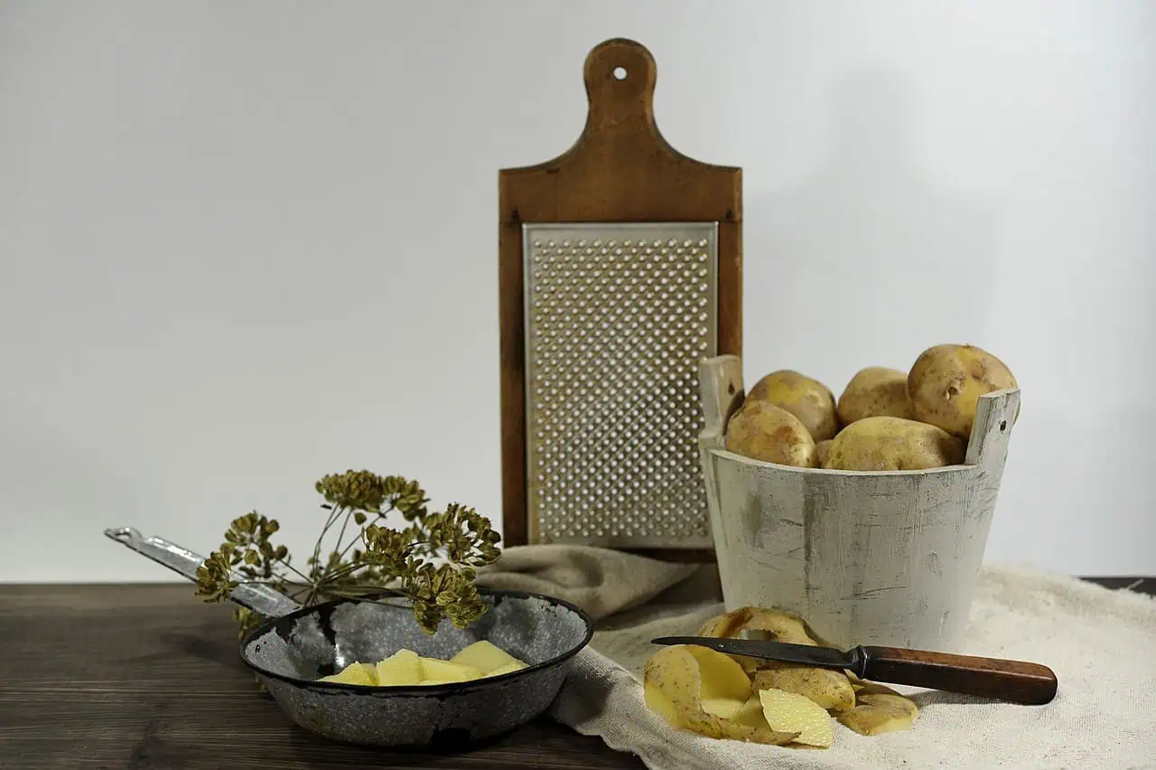 Surový, ošúpaný zemiak nastrúhame, prebytočnú tekutinu zľahka vytlačíme a pridáme k mäsu.