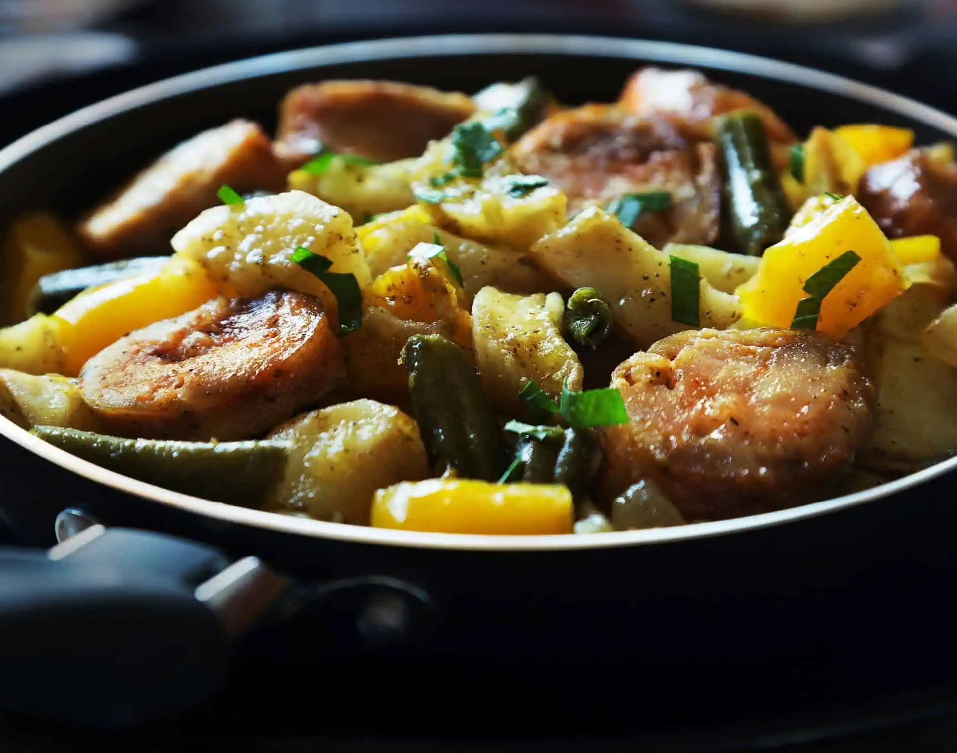Osmažené klobáska s fazuľou a zeleninou je veľmi chutný a hlavne sýty pokrm.