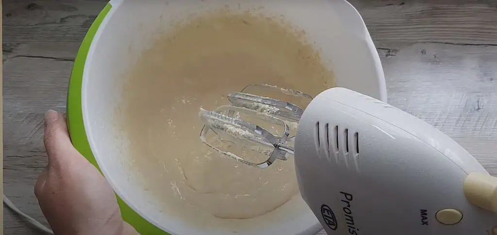 Do zmesi cez sitko preosejeme múku, prášok do pečiva a vanilín. Mixérom vyšľaháme riedke cesto.