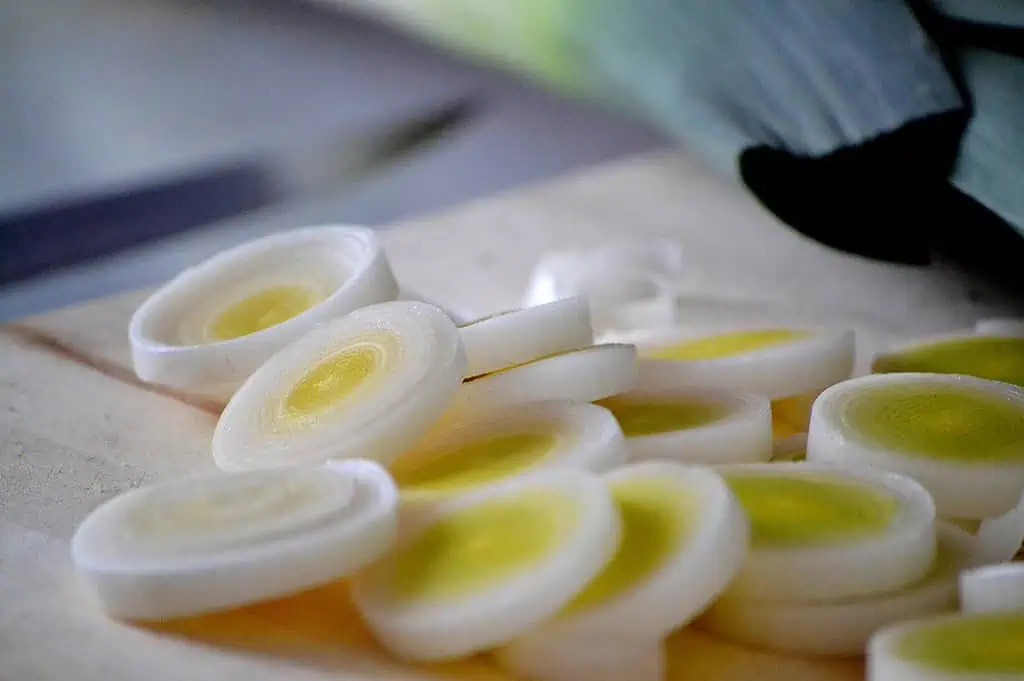 Medzitým pripravíme zeleninu: cibuľu a mrkvu nakrájame na kocky, bielu časť póru na plátky.