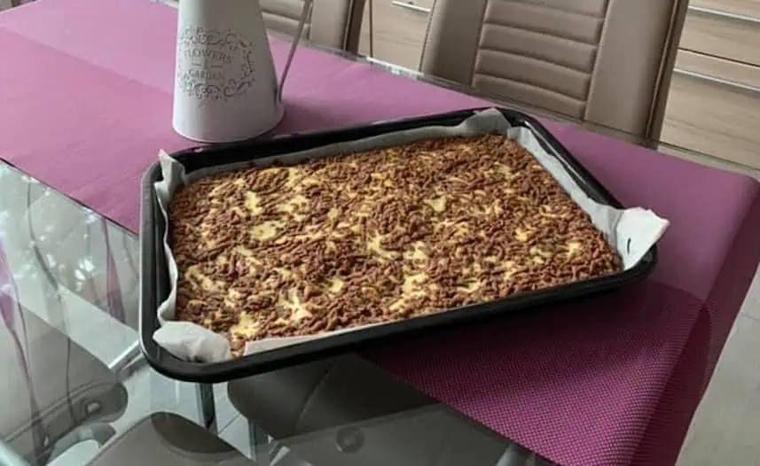 Tento koláč inšpirovaný kanálom Einfache Rezepte je pripravený zo strúhaného cesta, ktoré sa rozdelí na dve polovice – spodnú a vrchnú.