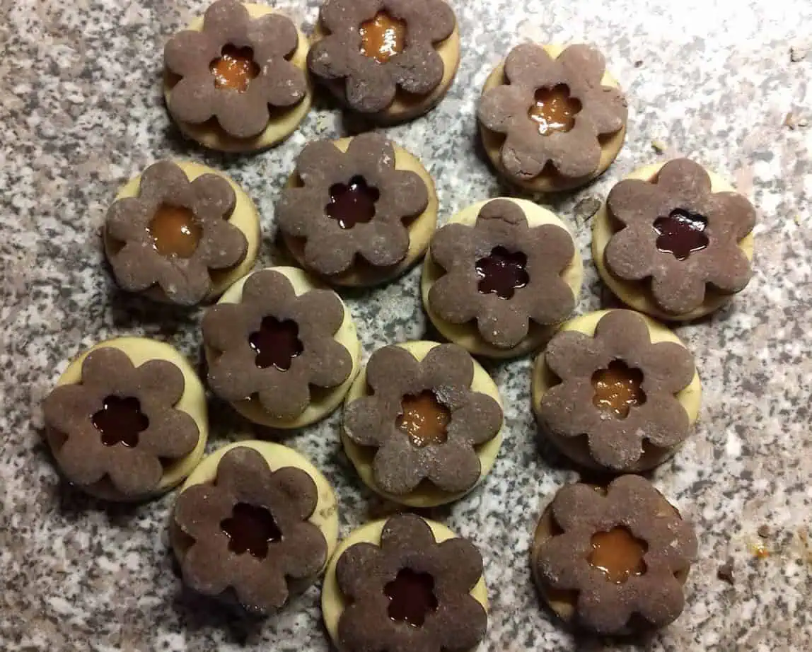 Z cesta môžete robiť sušienky ľubovolného tvaru – napríklad takéto dvojfarebné kvietky, alebo venčeky ako uvidíte vo videu.