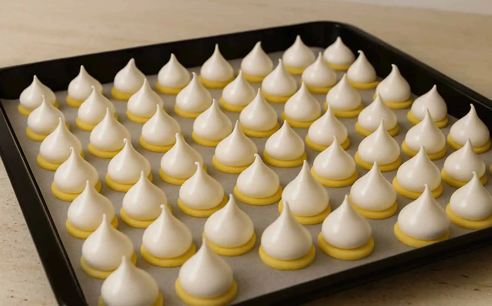 Preložíme na plech a navrstvíme sneh pomocou cukrárskeho vrecka.