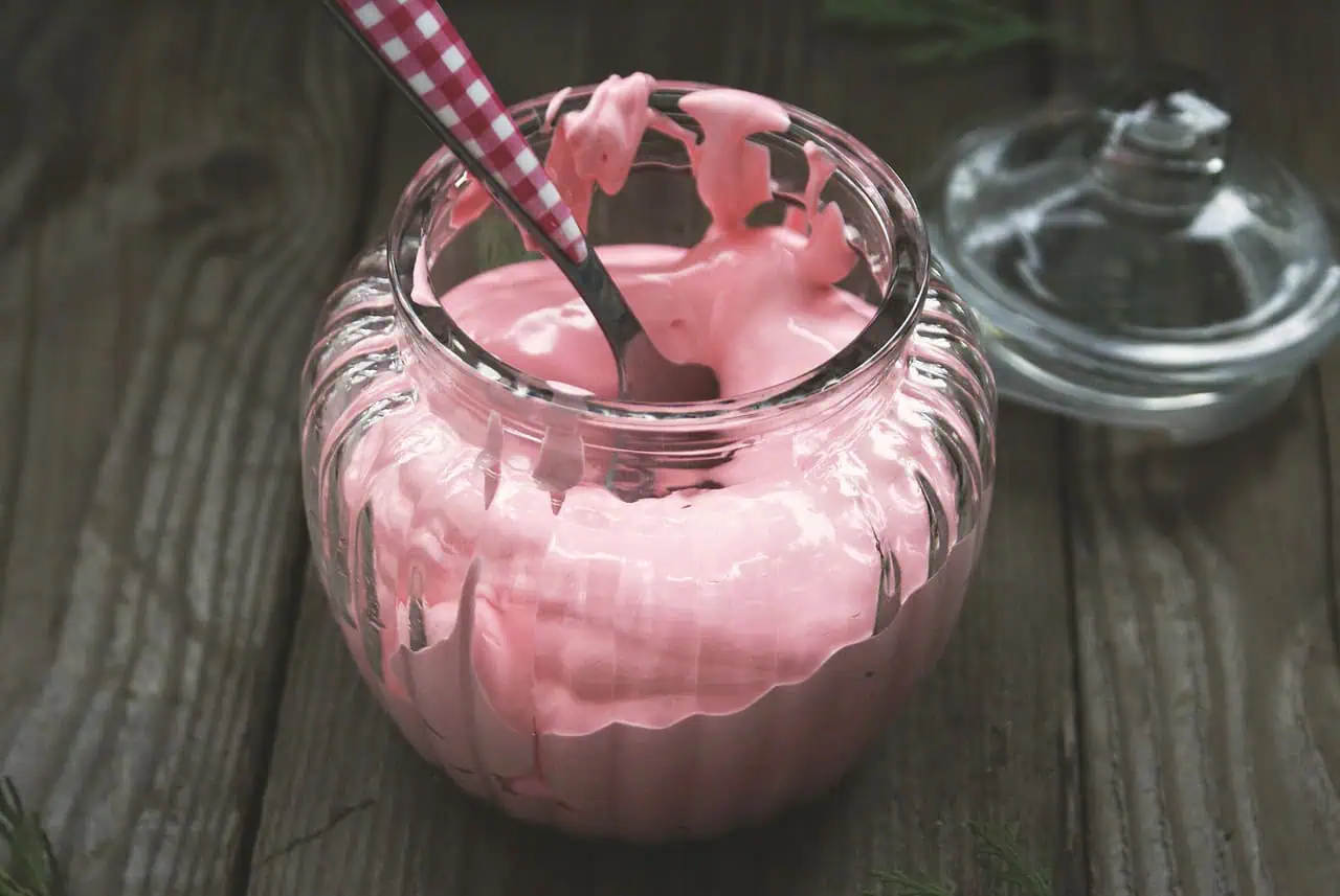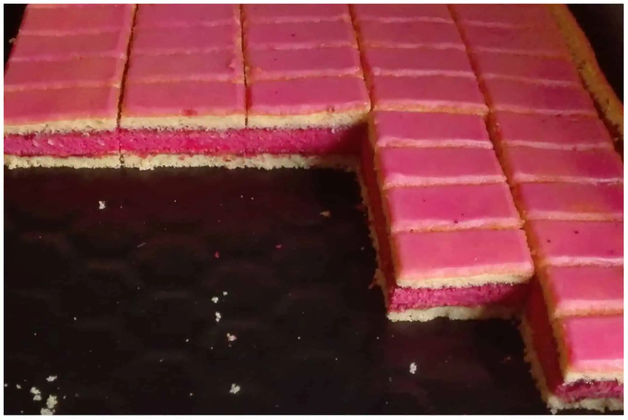 Druhé cesto pripravíme rovnako, ako to predchádzajúce, len do neho počas šľahania pridáme potravinárske farbivo. Takto pripravené cesto dáme piecť.