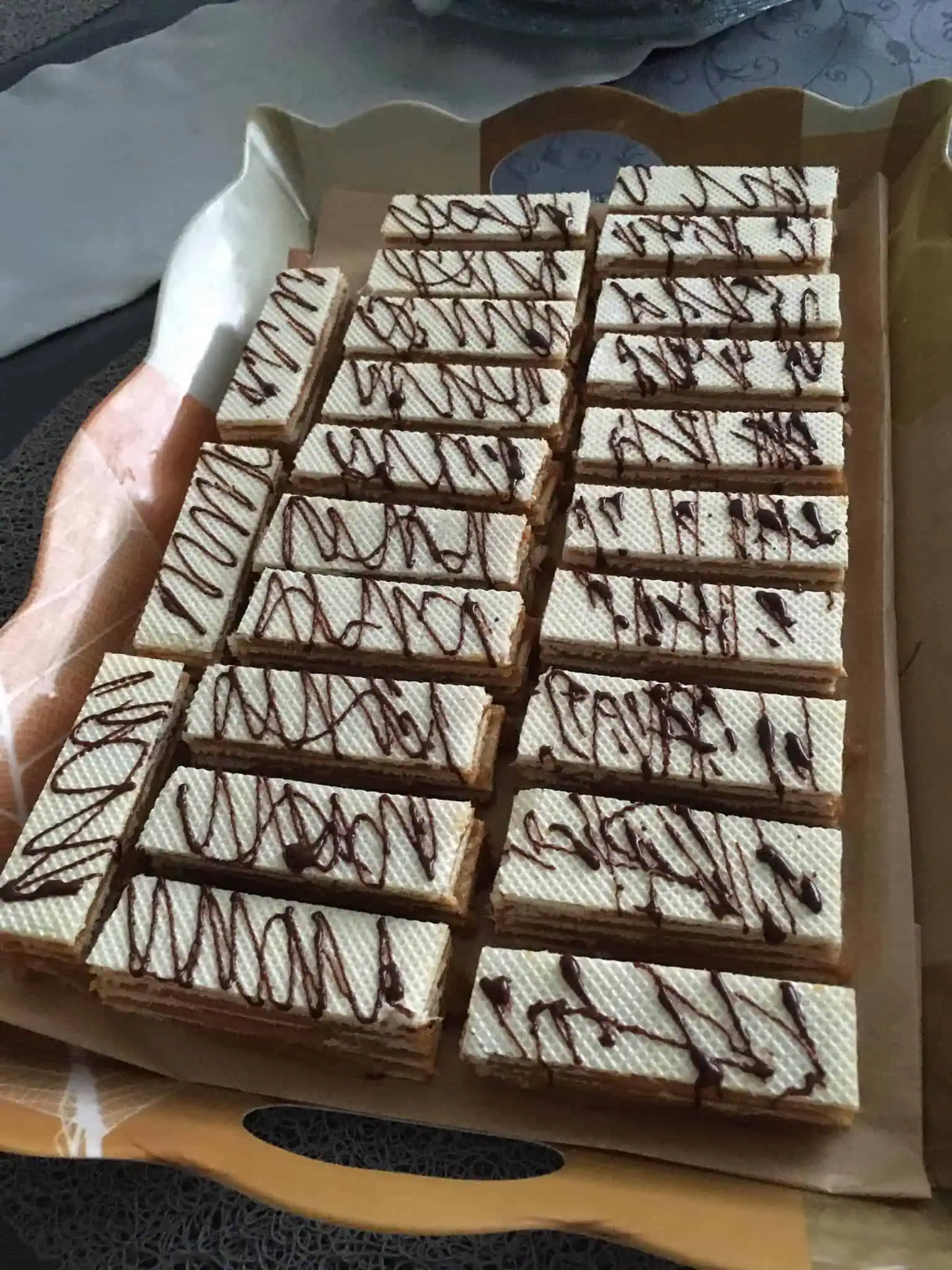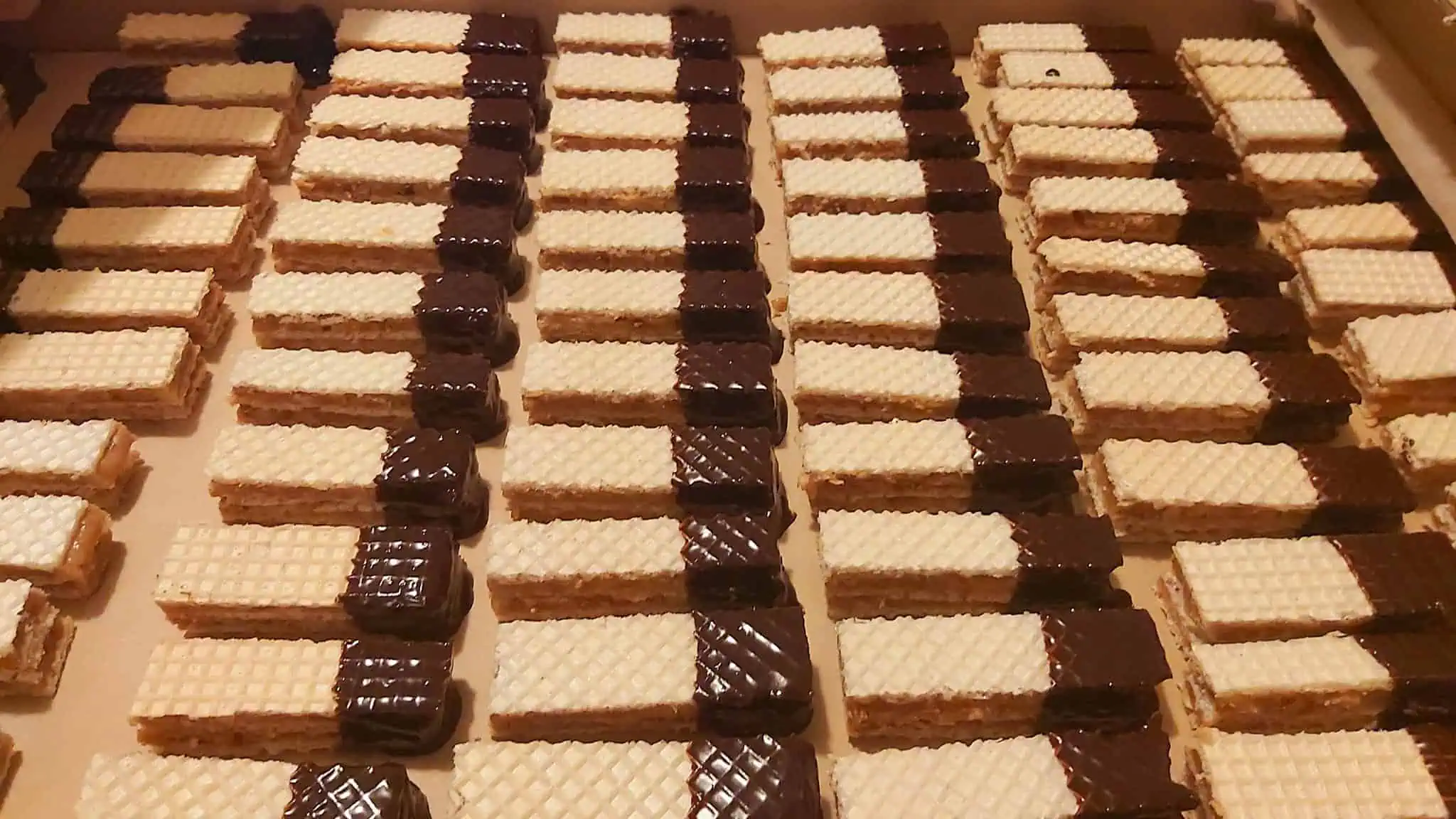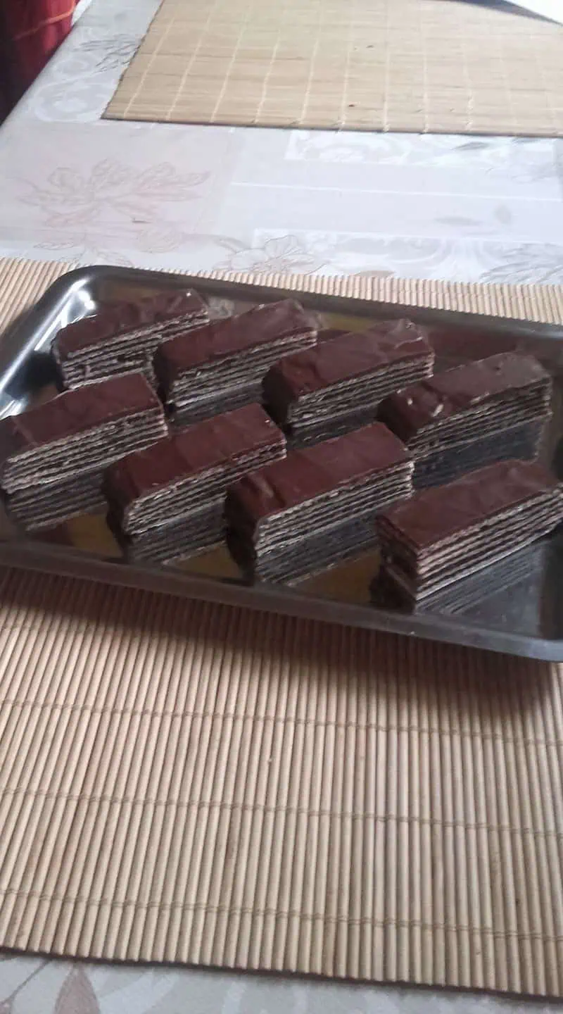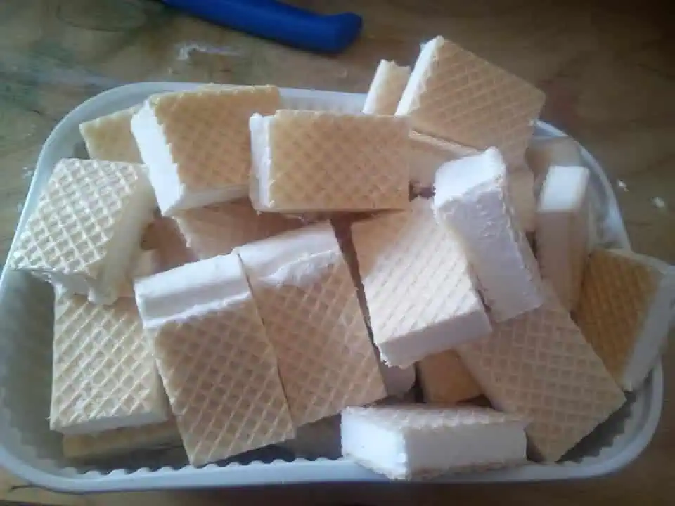 Necháme vychladnúť a potom začneme vrstviť. Na oblátku nanesieme tmavý krém, preložíme oplátkou a navrstvíme biely krém. Nakoniec prikryjeme posledným kusom oplátky. Zaťažíme a necháme stuhnúť v chladničke.