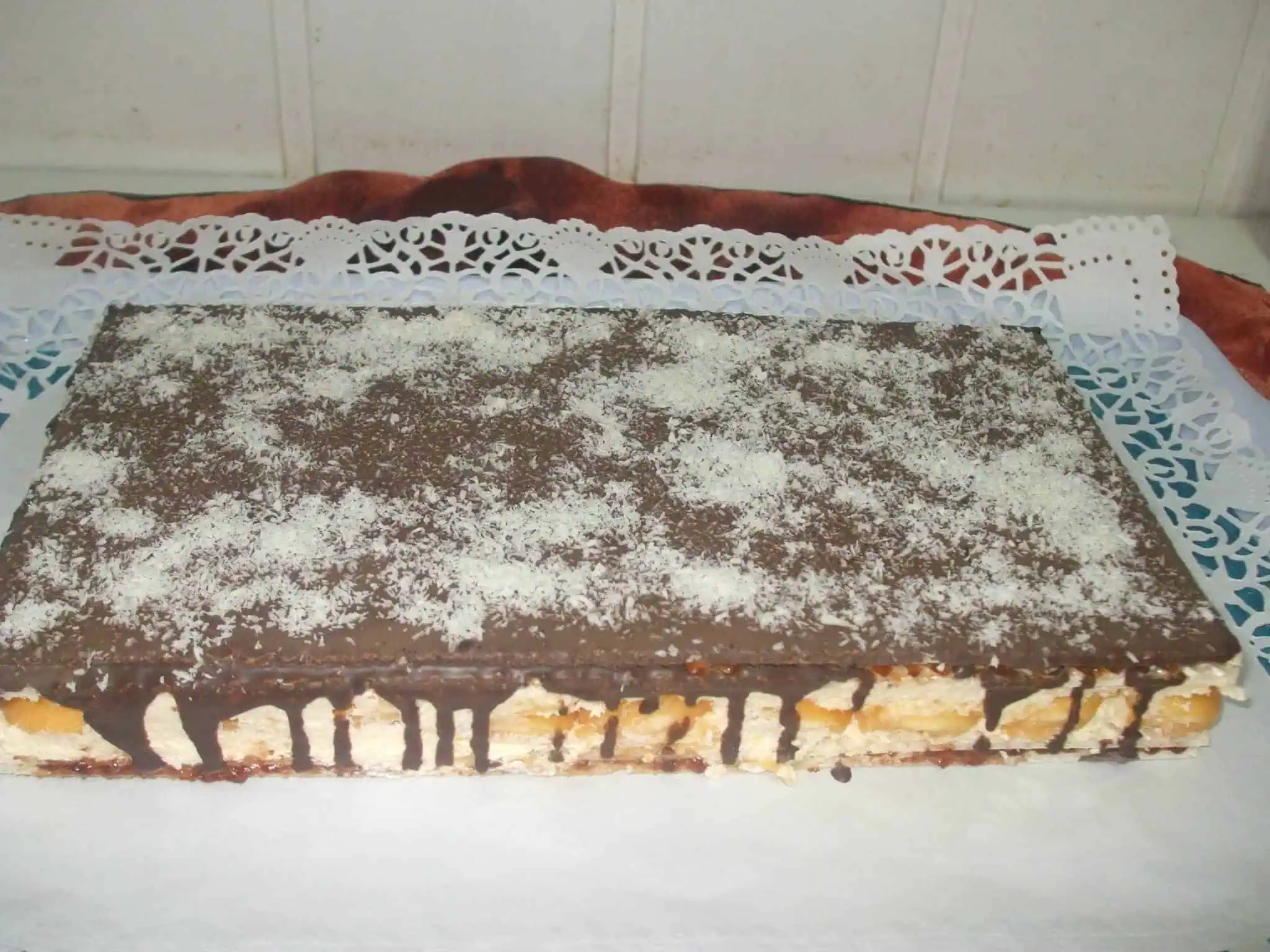 Ideme vrstviť – na prvú tortovú oblátku natrieme polovicu krému, na krém položíme vychladnuté cesto, pokračujeme druhou polovicou krému a tortovou oblátkou. Necháme cez noc stuhnúť a môžeme podávať! :-)