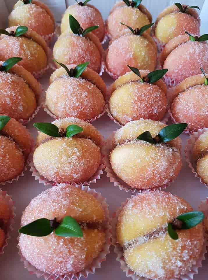 Plnka: zo surovín okrem masla uvariť puding nechať vychladnúť a potom primiešať maslo poriadne vyšľahať. Dve polovičky broskýň spájame krémom potom si ich pomocou štetca natierame rumom zarobeným s červeným potravinárskym farbivom a trochou vody tak, aby boli dosť premočené a pekne sfarbené. Obalíme v jemnom cukri a vkladáme do košíčkov. Na vrch zapichneme stonku a lístky z marcipánu.