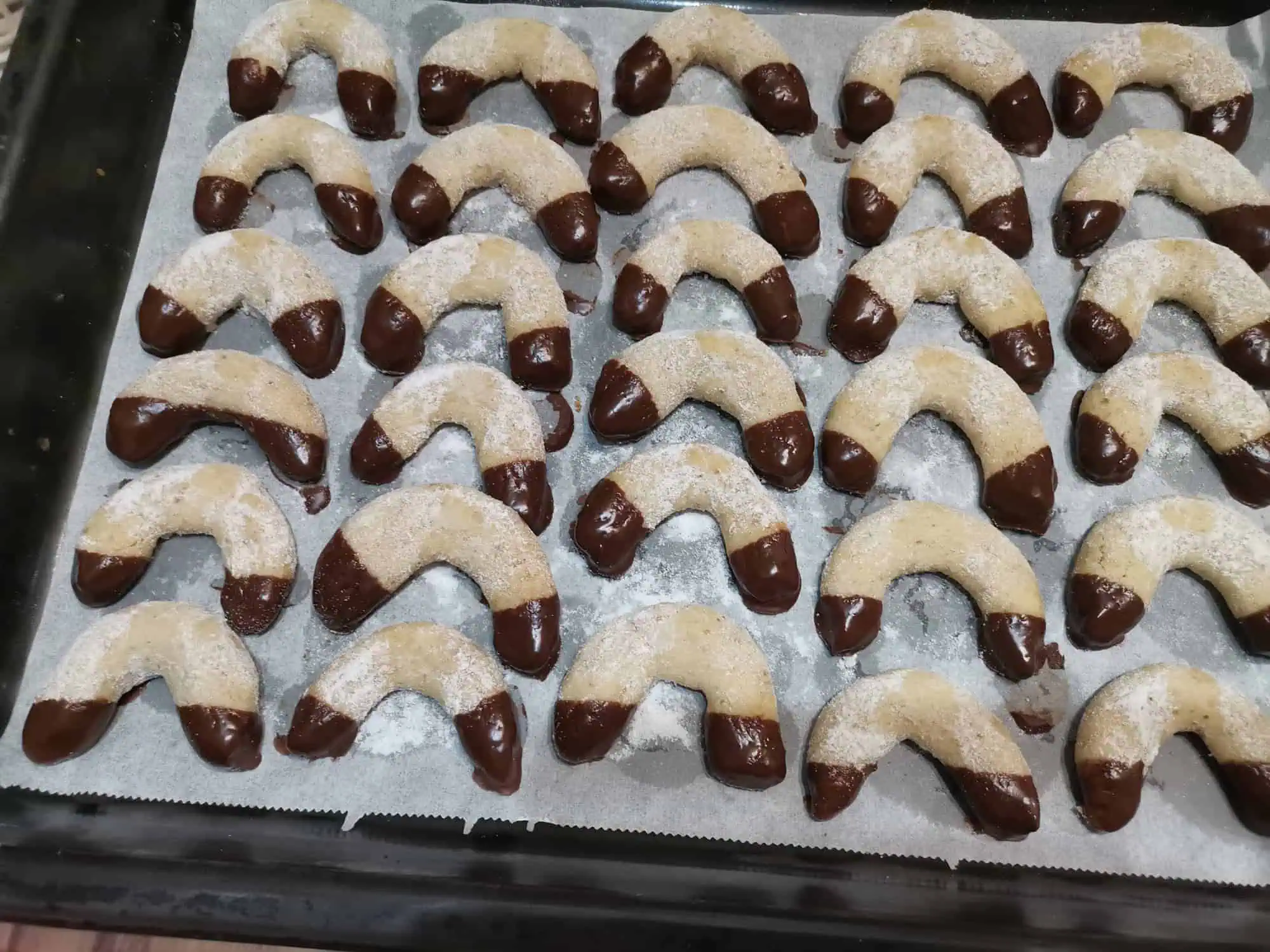 Necháme ich na plechu vychladnúť (po upečení sú veľmi mäkké a krehké, vyzerajú ako nedopečené, ale to nech vás nemýli) a ešte vlažnej obaľujeme v práškovom cukre zmiešanom s vanilkovým cukrom, prípadne môžeme namočiť do čokoládovej polevy.