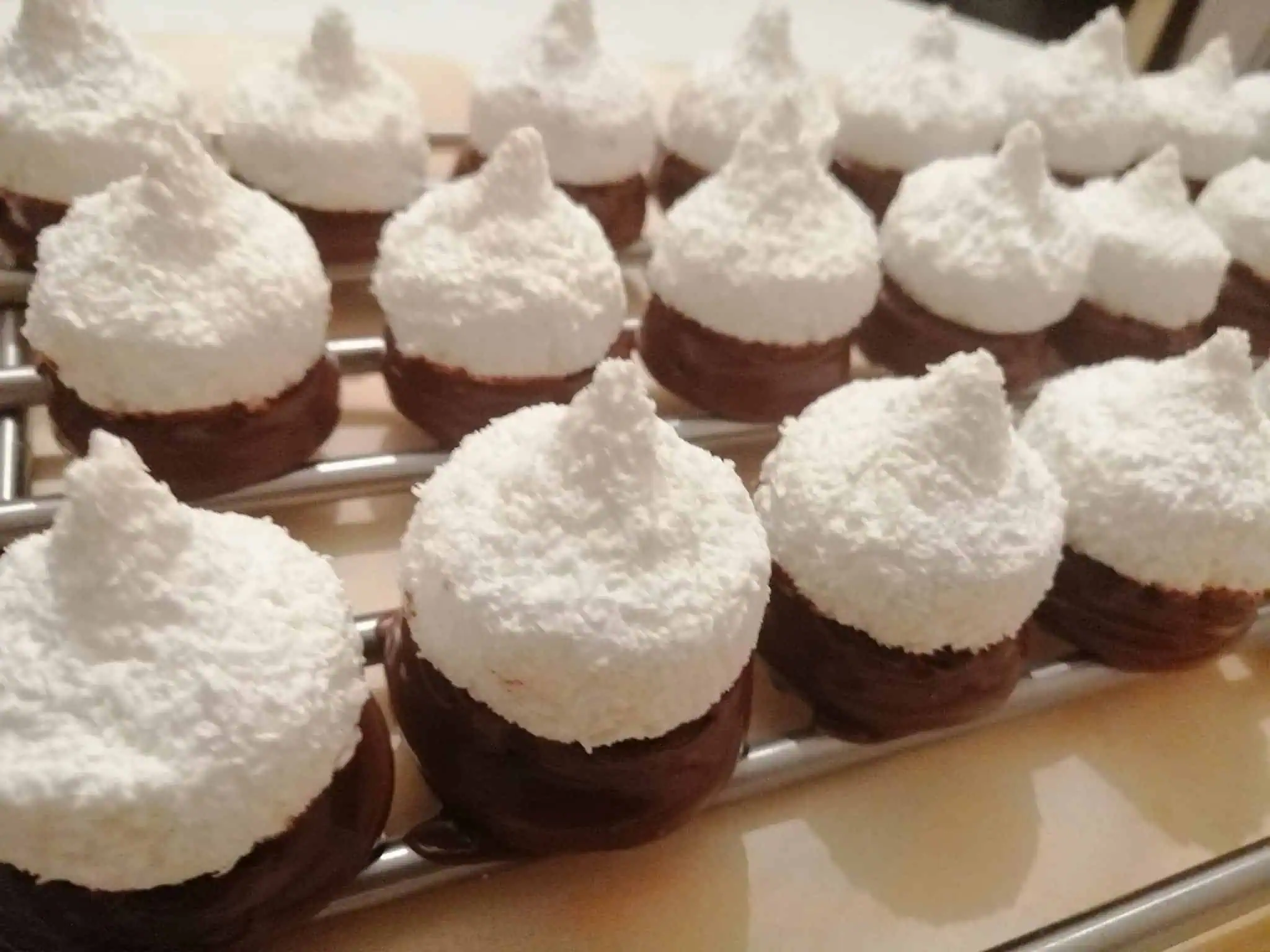 Po 30 minútach vyberieme z chladničky a spodky kokosiek namáčame do čokoládovej polevy. Ukladáme na plech pokrytý papierom na pečenie. Necháme stuhnúť.