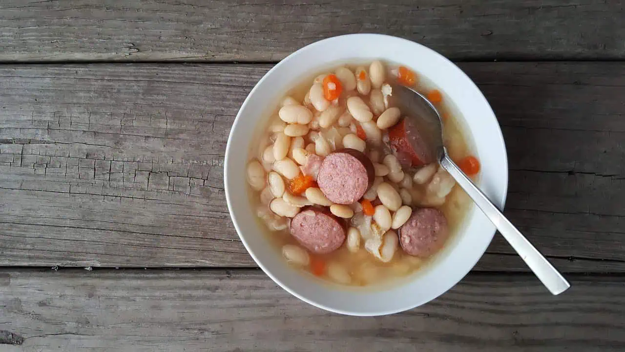 Pridáme zemiak nakrájaný nadrobno, nakrájanú mrkvu (aj ju použijeme), zmäknutú fazuľu a rozmiešané vajíčko – to v polievke ešte dobre premiešame. Necháme povariť a nakoniec pridáme aj pretlačený cesnak, nakrájanú klobásku (ak ju použijete) a kvapku octu. Na tanieri môžeme dozdobiť majoránkou alebo petržlenovou vňaťou.