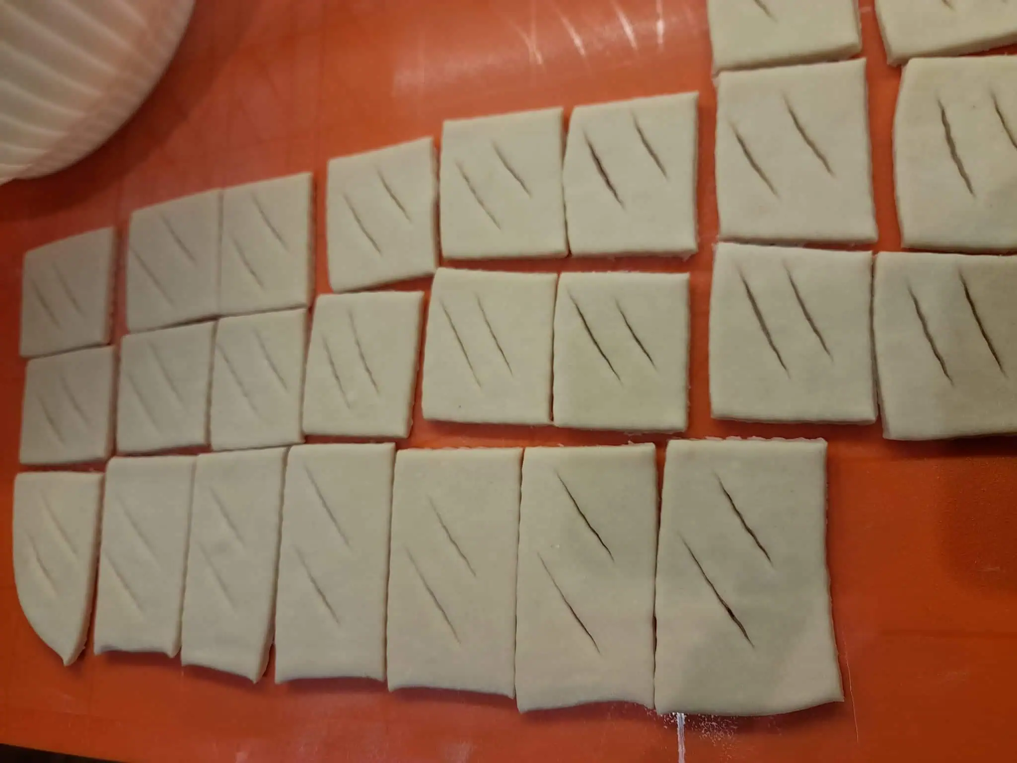 Nakrájajte cesto na obdĺžniky alebo pásiky. Do stredu každého kusu môžete urobiť zárez a prevliecť jeden koniec – vznikne tradičný tvar.
