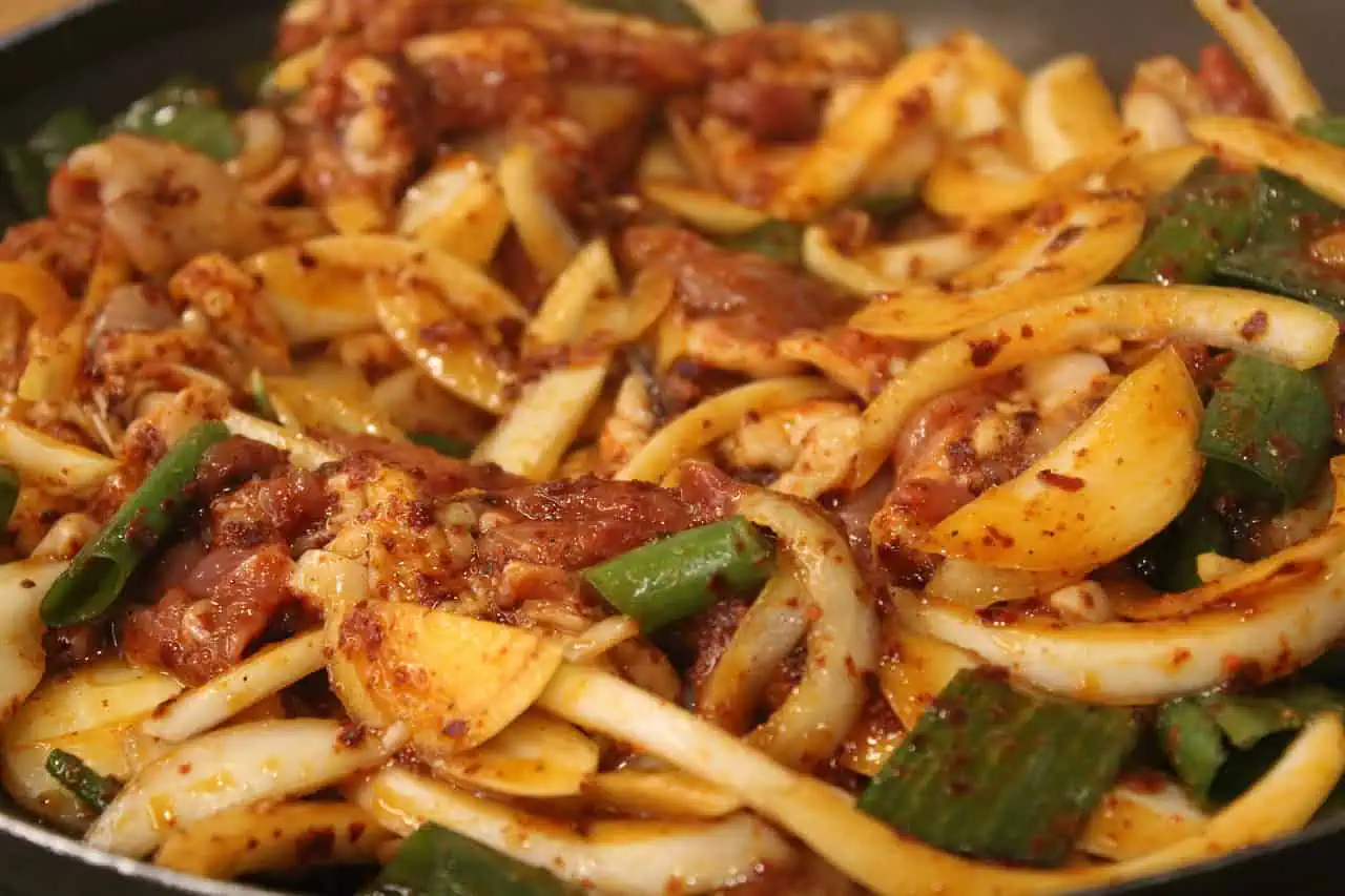 Rúru nastavíme na 190 stupňov. Zemiaky aj cibuľu očistíme. Mäso nakrájame na tenšie plátky a posypeme soľou, korením a cesnakovým prášok. Na niekoľko minút odložíme bokom.