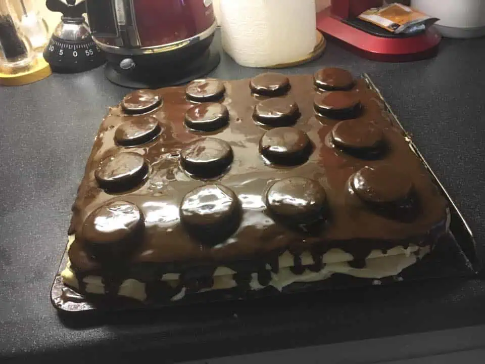 Na krém uložíme detské piškóty a nalejem polevu z rozpusteného masla a čokolády.