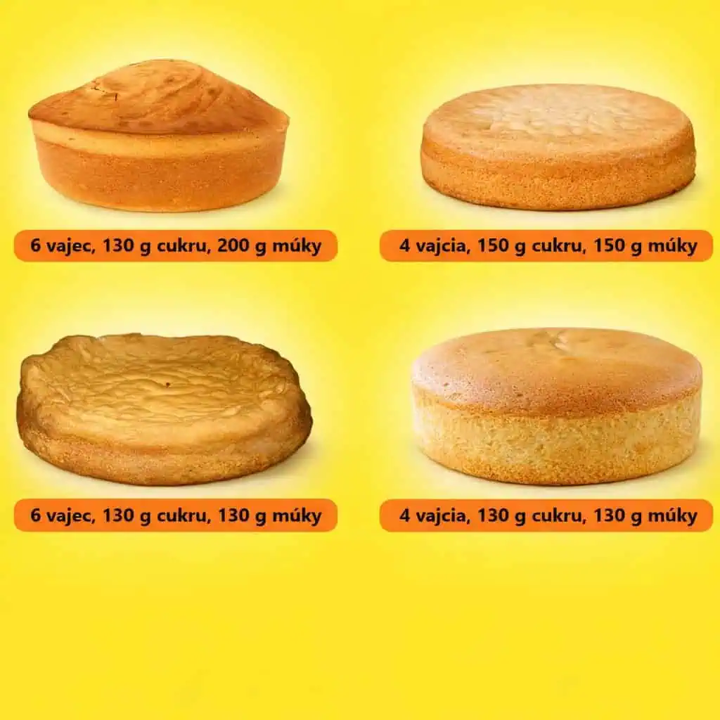Ukážky korpusov pri rôznom pomere vajec, cukru a múky.