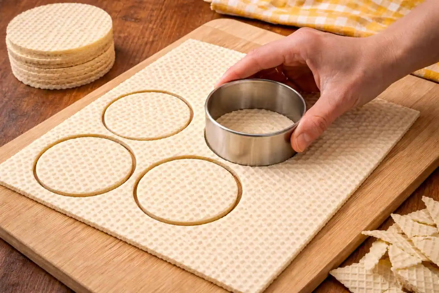 Začneme tým, že z tortových oblátok pomocou okrúhleho vykrajovátka vykrojíme tvar kruhu.