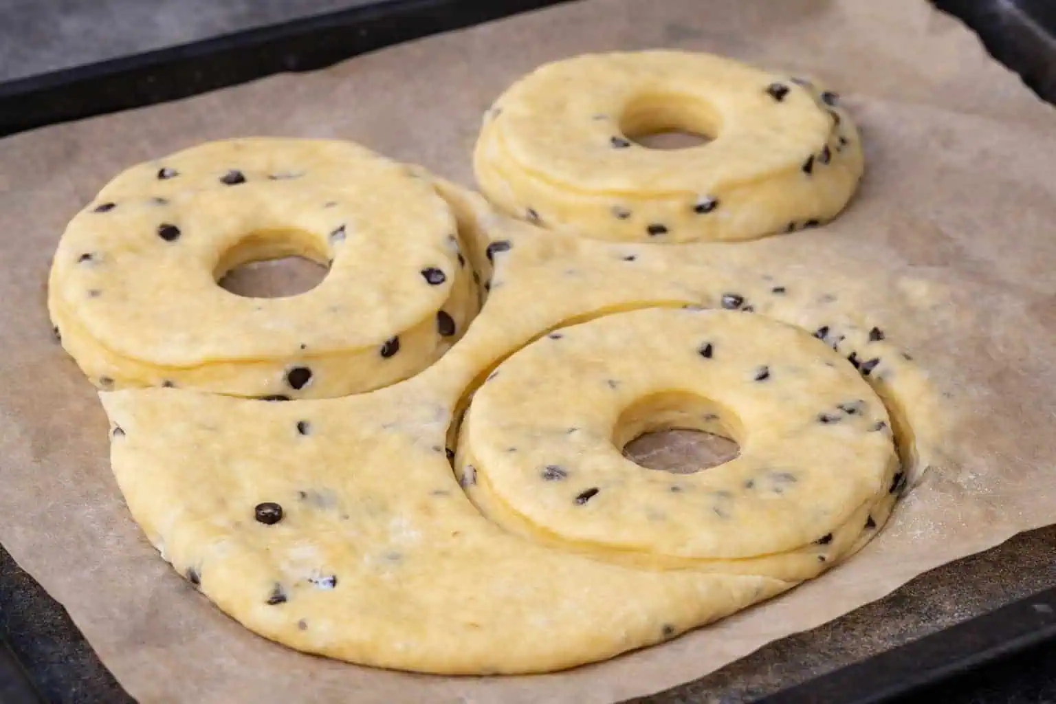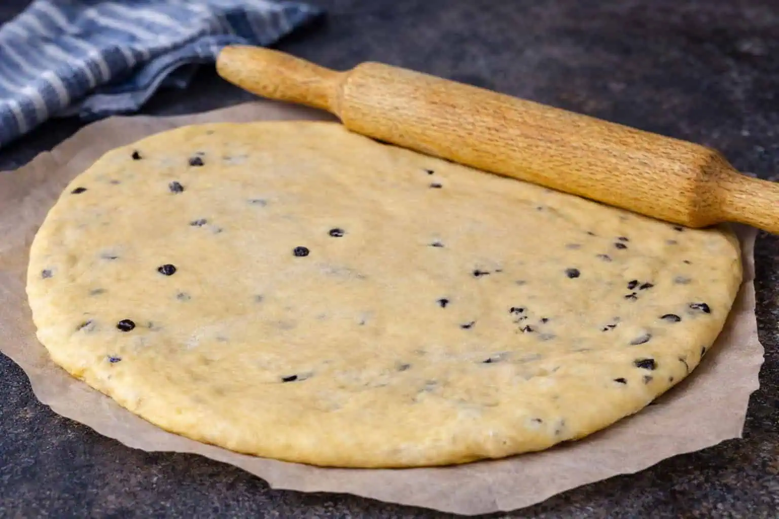 Keď cesto vykysne, vmiešame doň čokoládové lupienky, preložíme na dosku posypenú múkou a rozvaľkáme na hrúbku 1 cm.