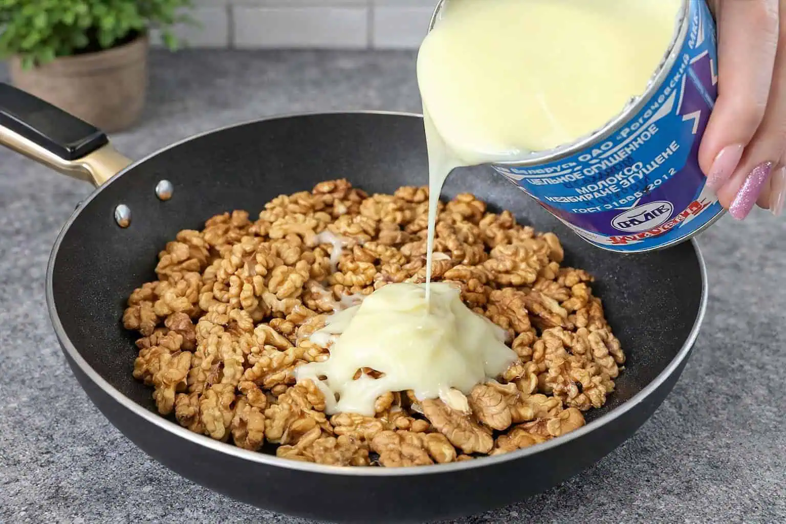 Vyšľahajte kondenzované mlieko s vlašskými orechmi.