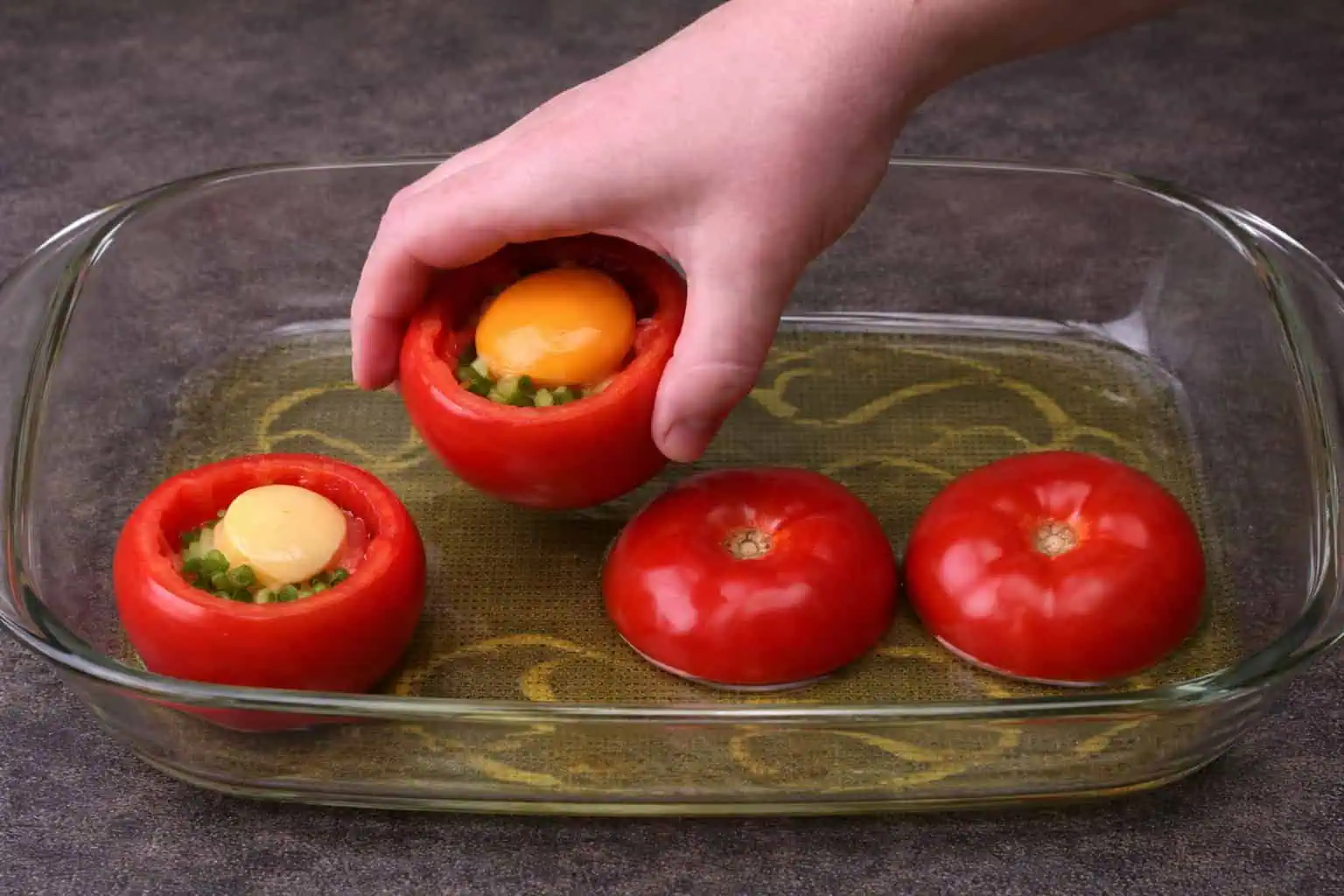 Odrezaný vrch z paradajok vložíme do misy vymastenej olejom.