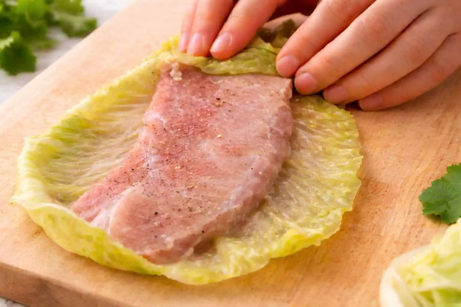 Kapustové listy zbavíme tvrdších častí, dáme do misy.