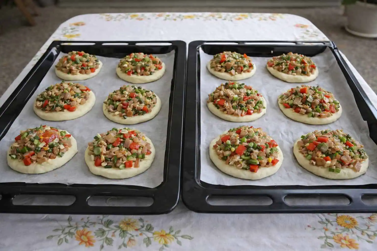 Potom guľky sploštíme a navrstvíme na každý kus lyžicu pripravenej plnky.