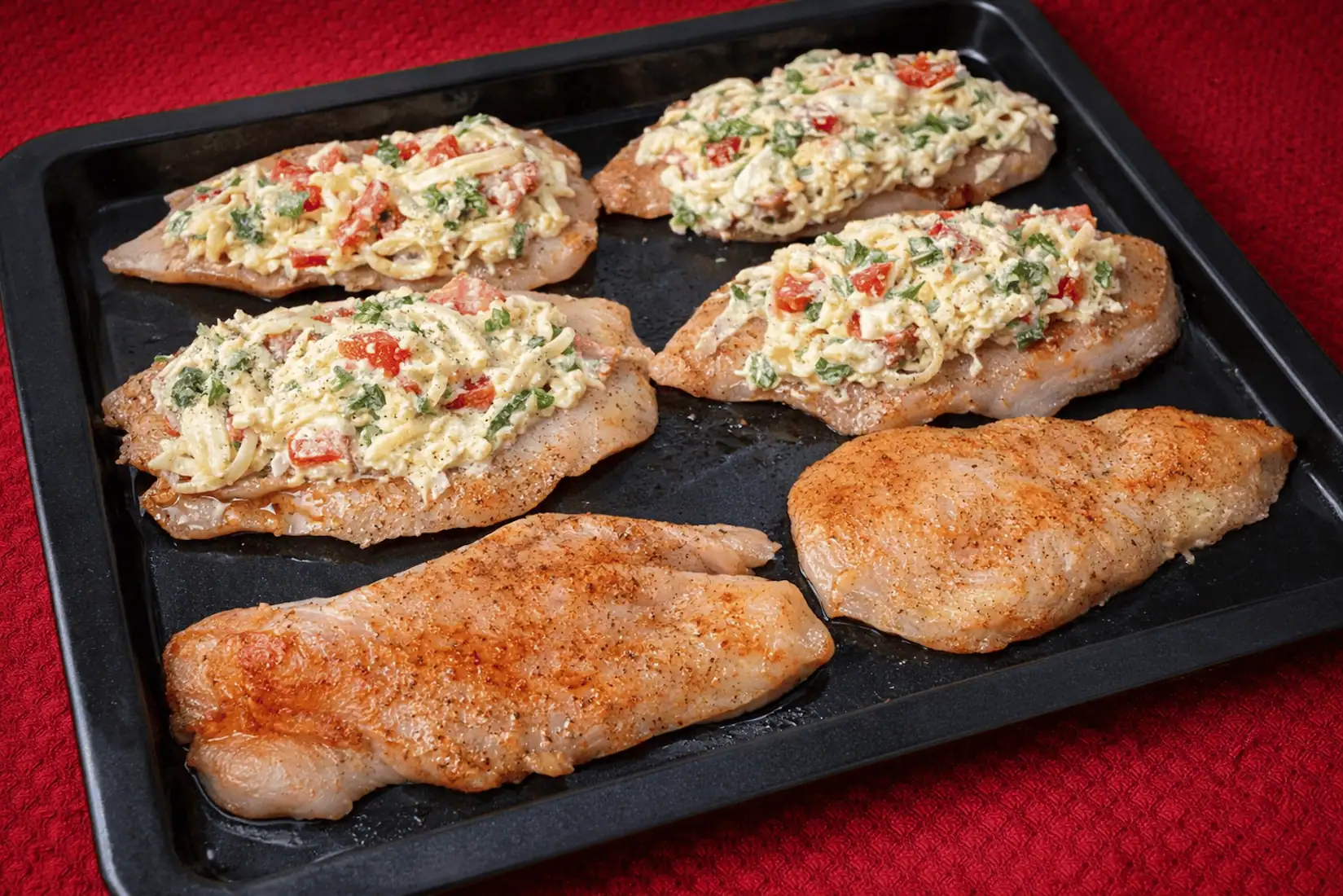 Mäso preložíme na plech vymastený olejom a potrieme horčicou. Uložíme plátok slaninky, kúsok papriky kúsok ostrej pariky, cibuľku, plátok šunky a potrieme kyslou smotanou.