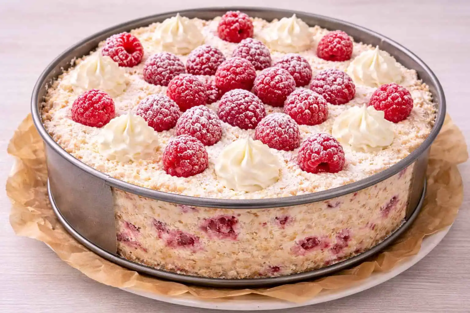 Výsledkom je jemná, krémová torta s ovocnou sviežosťou malín a príjemnou štruktúrou sušienok.