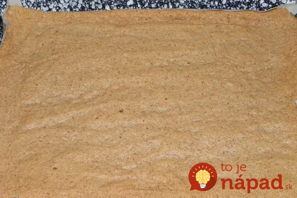 Žĺtky ušľaháme s 100 g cukru do peny, pridáme vodu, olej a nakoniec aj vlašské orechy. Bielky ušľaháme na tuhý sneh so zvyšným cukrom. Sneh premiešame do žĺtkovej hmoty. Navrstvíme na plech vystlaný papierom na pečenie, vložíme do vyhriatej rúry a pečieme pri teplote 180 stupňov 25 minút.