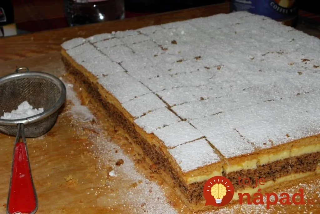 Na prvý plát cesta navrstvíme ½ pudingového krému, na krém uložíme orechový plát, zvyšný plát a druhú polovicu cesta. Poprášime práškovým cukrom a môžeme podávať.