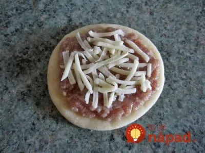 Teraz si pripravíme náplň. Vo väčšej miske zmiešame mleté mäso s cibuľou, prelisovaným cesnakom a vodou, v ktorej sme rozpustili bujón. Zmes dochutíme soľou, korením, červenou paprikou a dôkladne premiešame. Mäsovú zmes potom vrstvíme na jednotlivé kolieska a vrch posypeme strúhaným syrom.