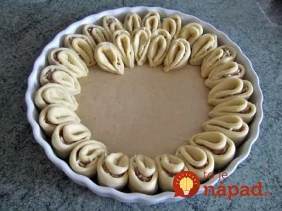 Každé koliesko preložíme na polovicu a potom ešte raz na polovicu. Konce zložených koliesok pevne spojíme, aby sa nerozpadli. Jednotlivé kolieska postupne ukladáme do formy na pečenie, ktorú sme si vystlali papierom na pečenie. Postupujeme od krajov ku stredu.