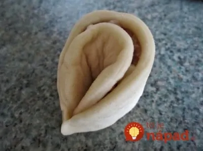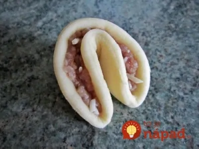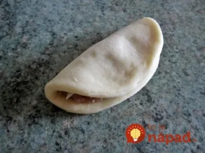 Zo zemiakového cesta oddeľujeme menšie kúsky, z ktorých vytvárame jednotlivé placky (hrubé 1-1,5 cm) a plníme mäsom. Cesto zrolujeme a okraje zatlačíme, aby náplň ostala vo vnútri.