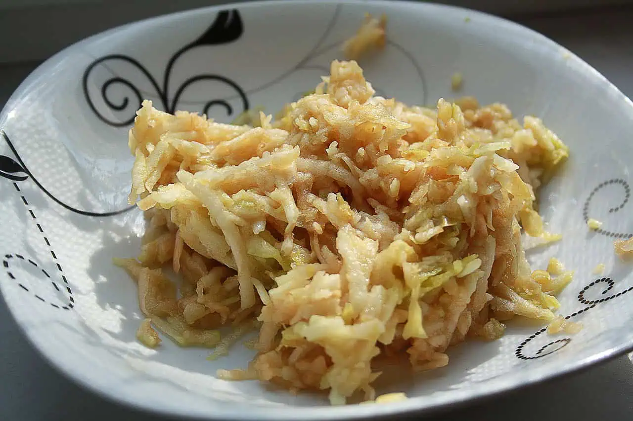 jablká nastrúhame a zmiešame s cukrom alebo medom, citrónovou kôrou a škoricou.
