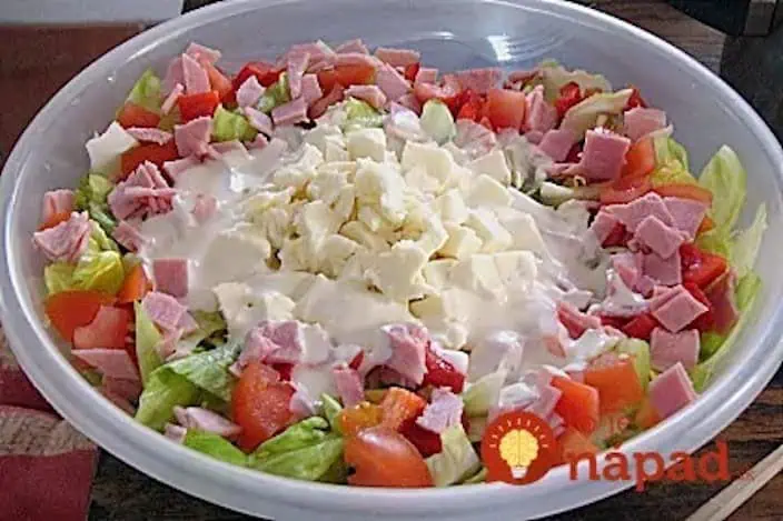 Nakrájajte ľadový šalát, papriku, cibuľu, uhorku, šunku a paradajky na malé kúsky.