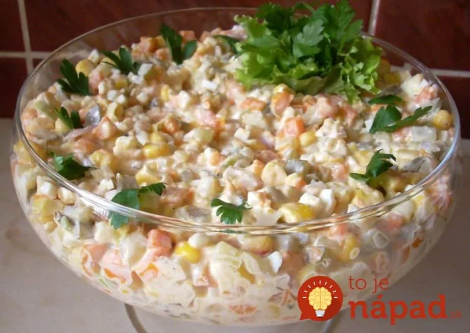 Do misy naukladáme vrstvy surovín, ako idú za sebou, podľa receptu. Necháme do druhého dňa odležať. Potom všetko premiešame a podávame. Ak podávate k rezňom, šunku môžete vynechať a dajte namiesto nej natvrdo uvarené vajce (2 ks). Tiež môžete pridať 1 nakrájané zelené jabĺčko.