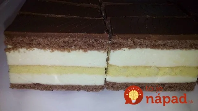 Vytvoríme zákusok: na kakaové cesto navrstvíme 1/2 krému, uložíme žlté cesto a druhú polovicu krému. Prikryjeme druhým kakaovým plátom.