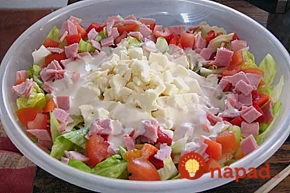 Nakrájajte ľadový šalát, papriku, cibuľu, uhorku, šunku a paradajky na malé kúsky. Zmiešajte so syrom nakrájaným na kocky.