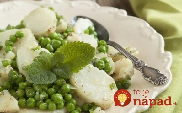 Uvarené zemiaky pokrájame a zmiešame spolu so zeleným hráškom. Polejeme zálievkou z oleja, octu a kôpru. Nakoniec osolíme a okoreníme. Podľa chuti pridáme cukor.