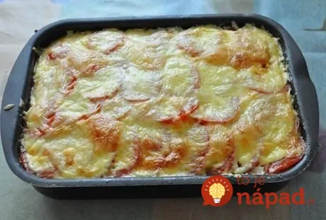 Vložíme do vyhriatej rúry a pečieme pri teplote 200 stupňov 30 minút. 15 minút pred dopečením posypeme syrom.