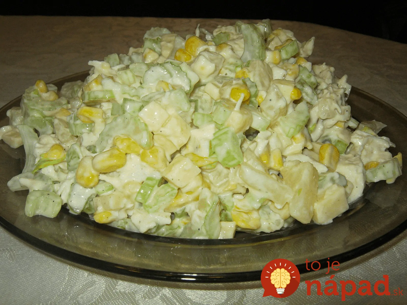 Majonézu zmiešame so smotanou, dochutíme soľou, čiernym korením a štipkou cukru. Pridáme do šalátu a dôkladne premiešame. Pred podávaním necháme pár hodín v chladničke. Šalátik je výborný, odporúčam!
