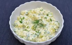 Výborný a ľahký šalát z cukety a domácej majonézy, zjemnený jogurtom a zelenými bylinkami.